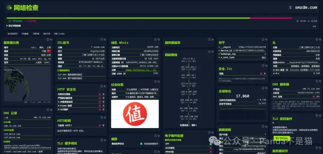 这里针对值得买进行检测,能看到包括dns信息、ssl证书信息、域名信息以及你的IP路线追踪信息等等