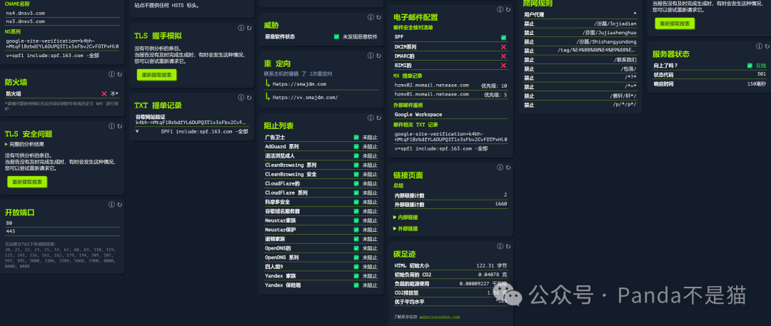 除此之外,能看到网站禁用的爬虫规则、是否挂有恶意软件等等一系列很深入的信息。