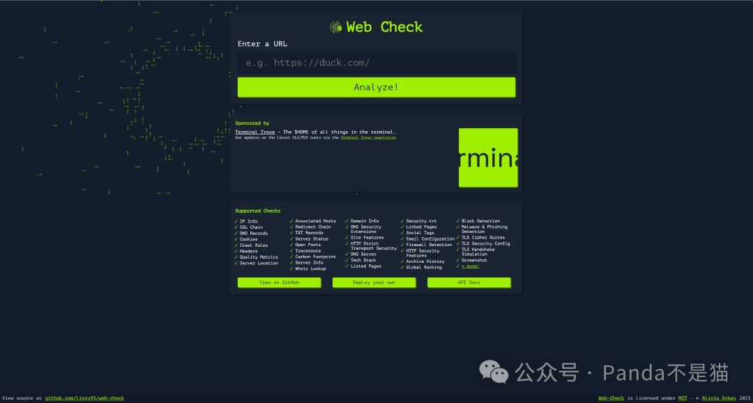 只需要输入一个网站就可以查看一个网站几乎所有信息,IP信息、SSL、DNS记录、Cookies、域名信息、搜索爬虫规则、服务器位置、重定向记录、开放端口、路由跟踪、DNS安全扩展、网站性能、关联主机名等等等。很强大的项目,不过如果能有大佬汉化一下就更不错了。