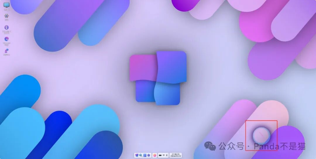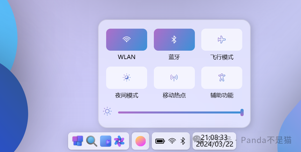 下方的dock栏分为了几个部分,有应用、集成win11的小组件、搜索以及Windows系统的copilot智能AI,右边还有浅色深色模式的切换、快捷控件以及日历和当前时间显示。