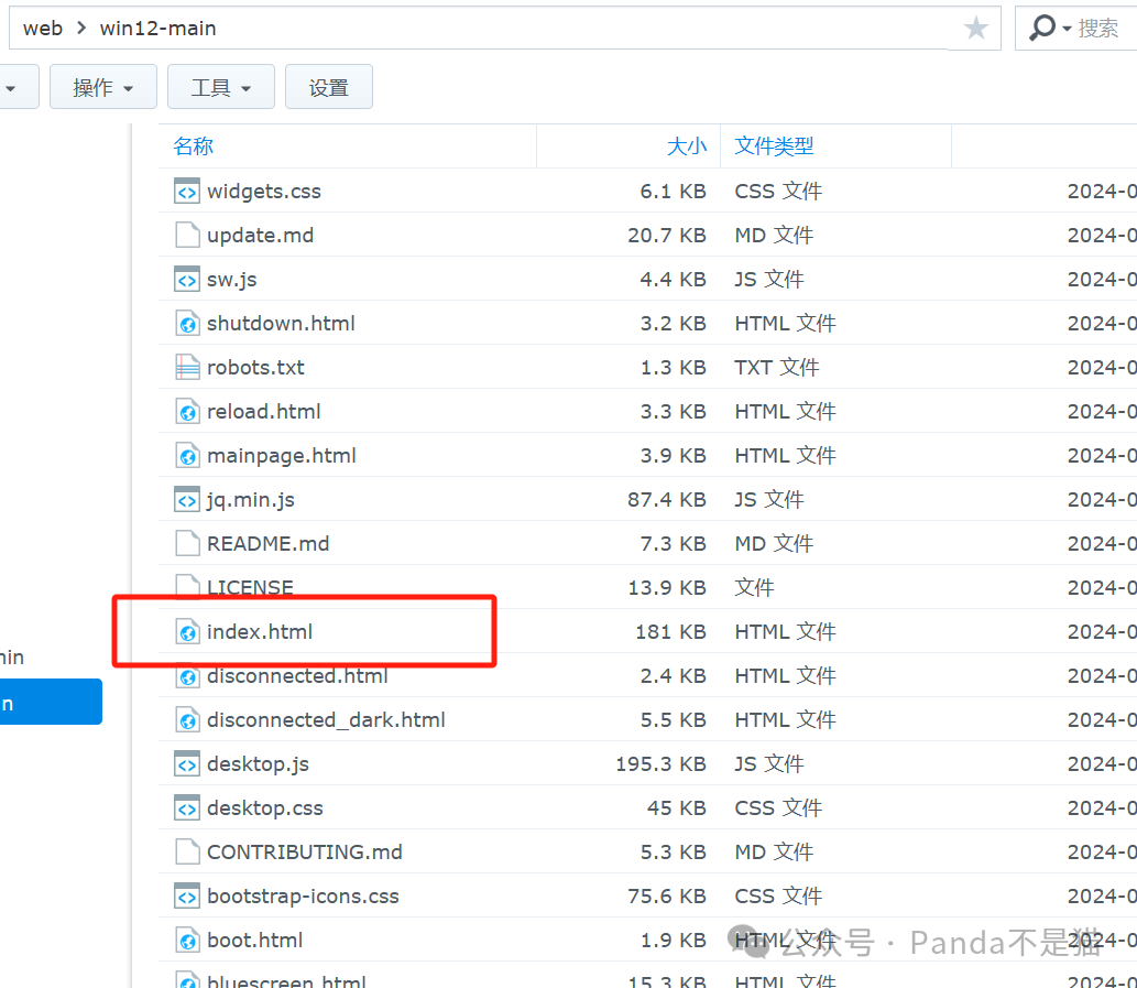下载好项目之后我们将其解压缩之后放到群晖的web界面,因为群晖并不能主动识别或设置项目启动文件,所以我们需要将其重命名为群晖能识别的默认文件名。将文件根目录中的desktop.html文件重命名为index.html。