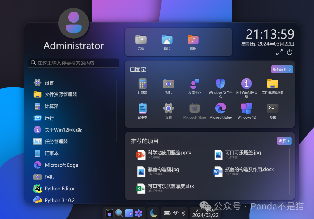点击开始界面,交互动画做的很不错,同时可以看到目前内置的win系统小功能基本都有,例如记事本、任务管理器以及Edge等等,这些都不是装装样子的图标,而是每一个都可以点进去的应用,且能显示目前系统的正式状态(不过任务管理器不显示系统配置)