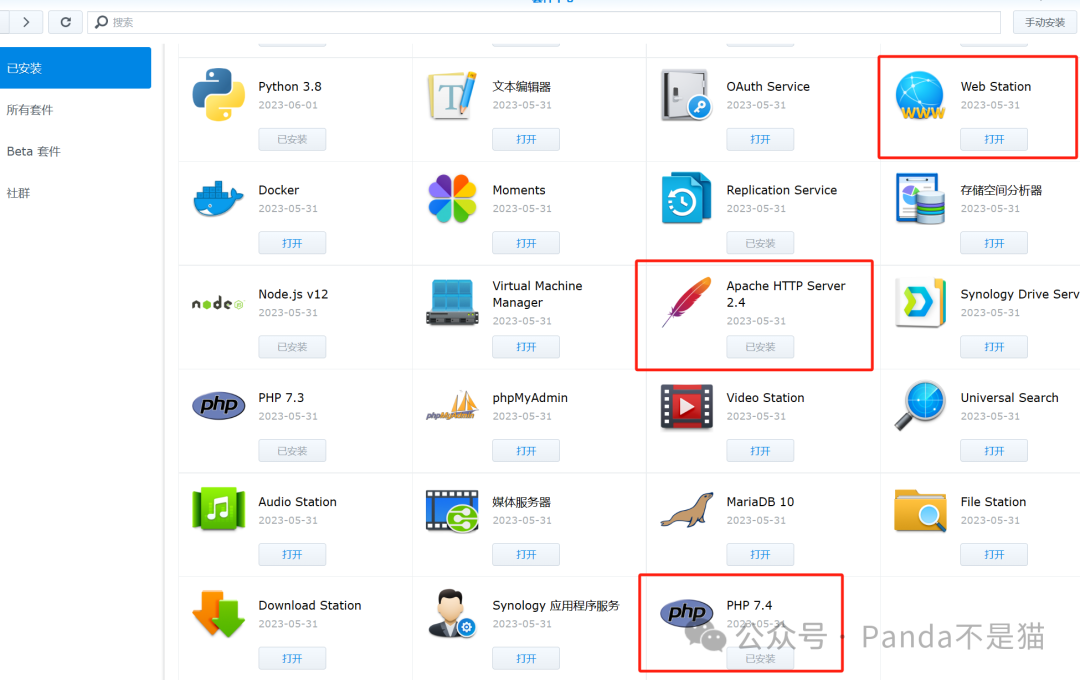 该项目为php项目,同时没有docker镜像,所以这里我们需要部署只能用到NAS的web功能。我们需要安装好PHP、Apache以及Web Station三个套件。我这里为6.x的系统,7.x系统可能名字不一样,但操作思路一样的。