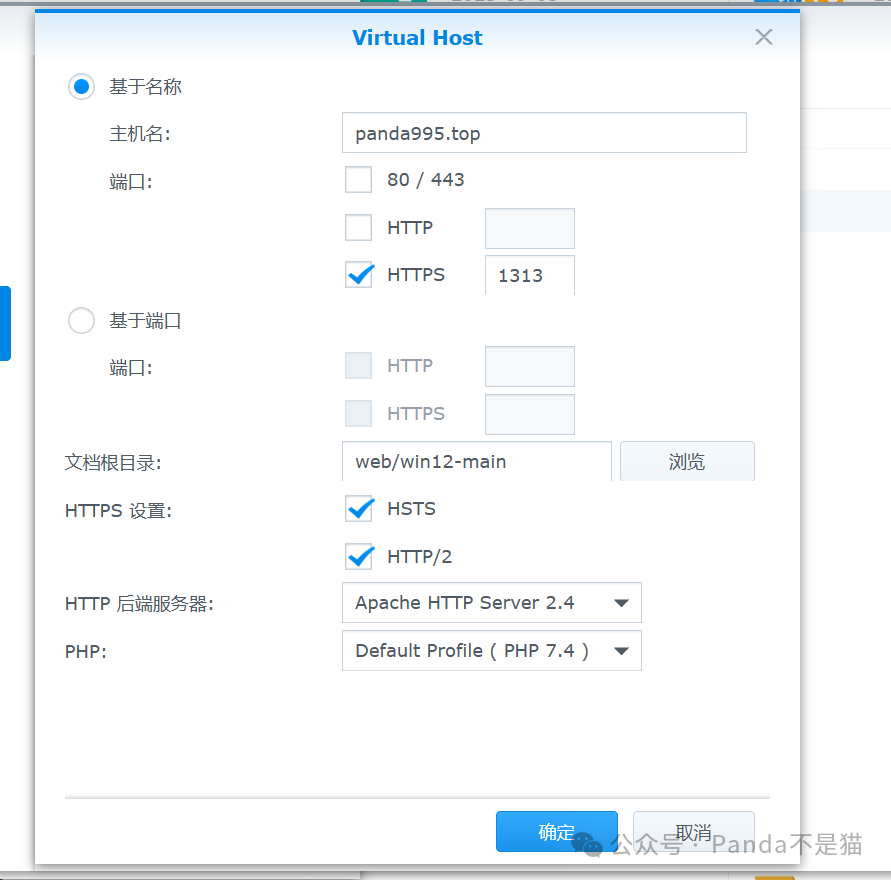 这时候再转到虚拟主机界面,按照我这里的设置例子进行设置。如果有域名可以直接选择基于名称,名称填写你的域名即可,端口http或https均可(有证书用https),文档根目录便是项目的根目录。