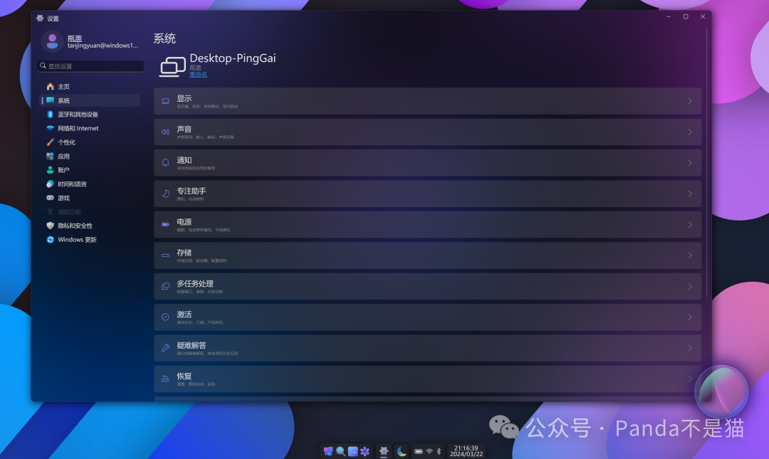 点开设置界面,这里有一些子项就是装饰了,例如设备信息、更新等等这些都是不可点击的。另外我发现一个细节,右下角的动态元素为半透明形式,即便打开设置界面或者其他应用它也是置顶存在的,看着非常不错。