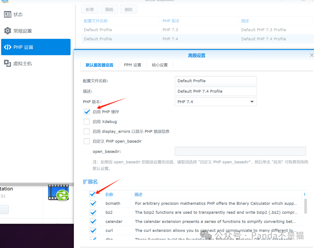 此时转到Web Station套件中,将php的扩展全部打开,并启动php的缓存功能。