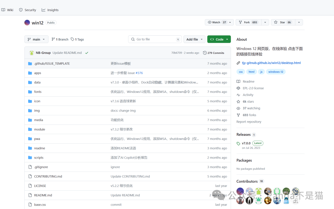 同时我们需要去到项目主页下载好源代码,这里直接github搜索win12网页版就能找到项目了,目前已经有6k的星标了。可以的话记得点点star哦!