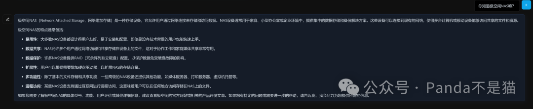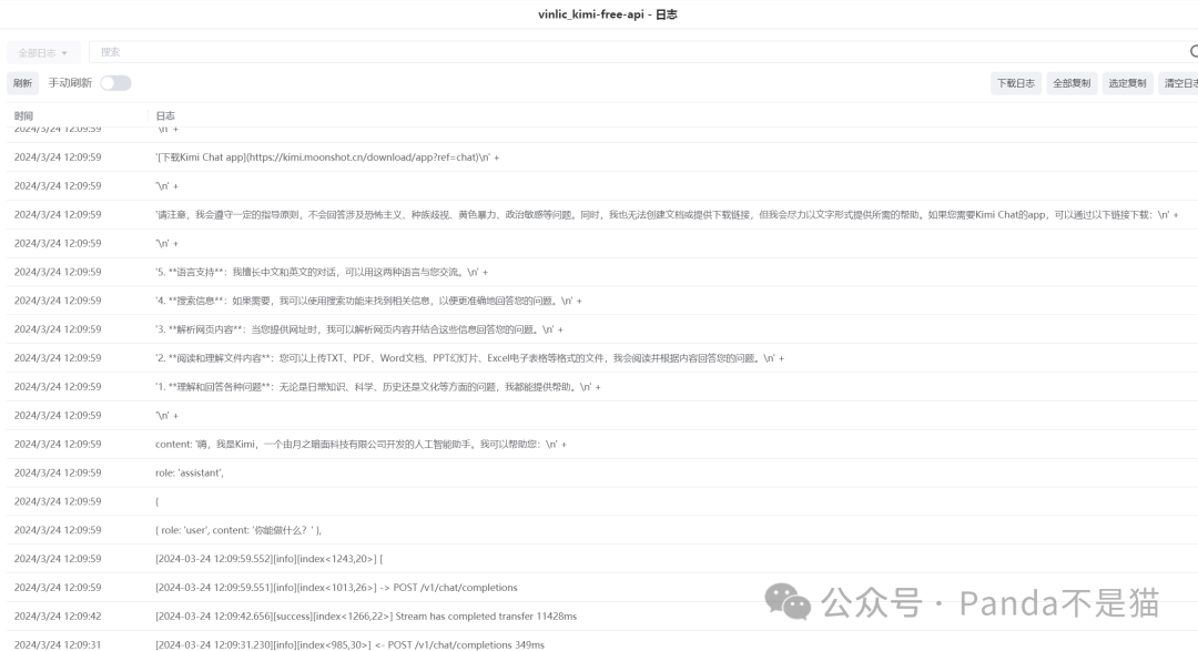 此时我们再进行问答,便是使用的kimi的服务了。同时在极空间容器日志中也能看到对话的内容。