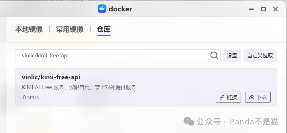 直接打开Docker仓库界面搜索:kimi-free-api下载镜像,镜像并不大,部署好也就200多M。(需要注意的事,该项目目前仅用于自用)