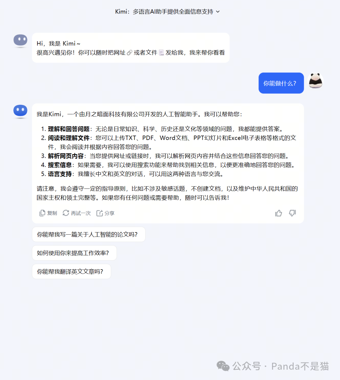根据对话展示可以看到,kimi拥有理解并回答各种问题、阅读和分析文件能力、解析网页内容能力、搜索信息能力以及中英文双语对话能力。