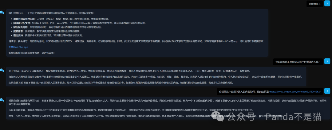 智能助手的能力我就不多展示了,其实kimi最重要的就是可以根据文件和网址来分析总结内容,也能根据你的问题来给到一些合理性的建议,虽说建议都比较理想化,但好在回答都不会抽风,不会出现答非所问或者很奇怪的回答。