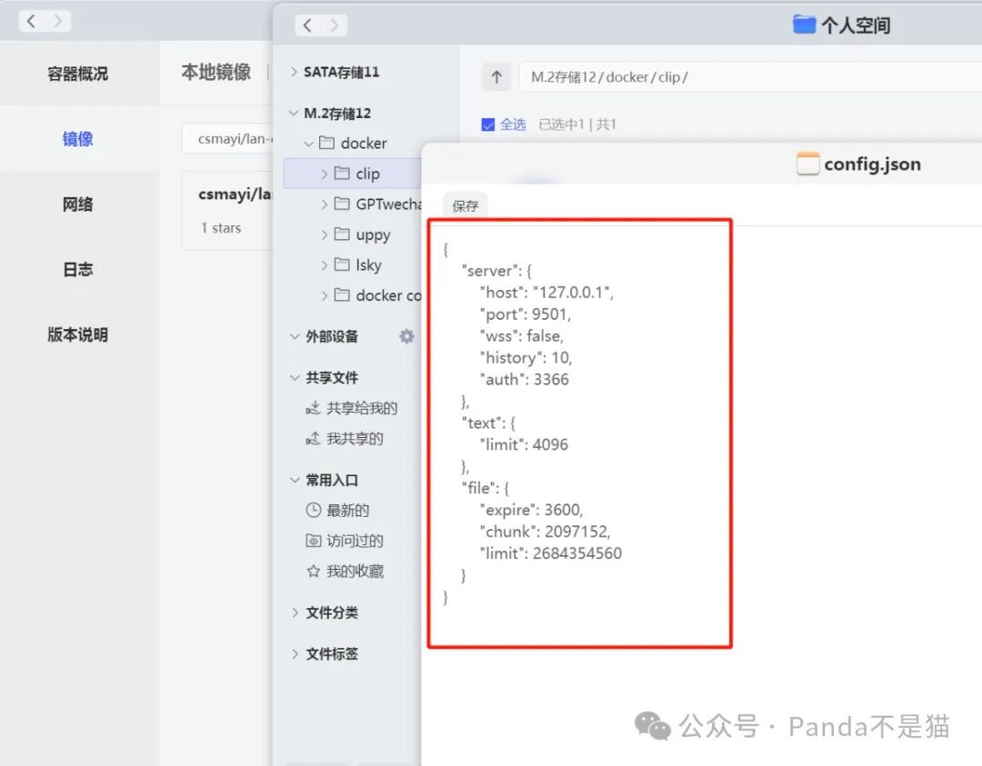 下载好之后我们在Docker文件夹中新建文件夹clip(名字随意,不能有中文)随后再新建配置文件config.json,内容如下: