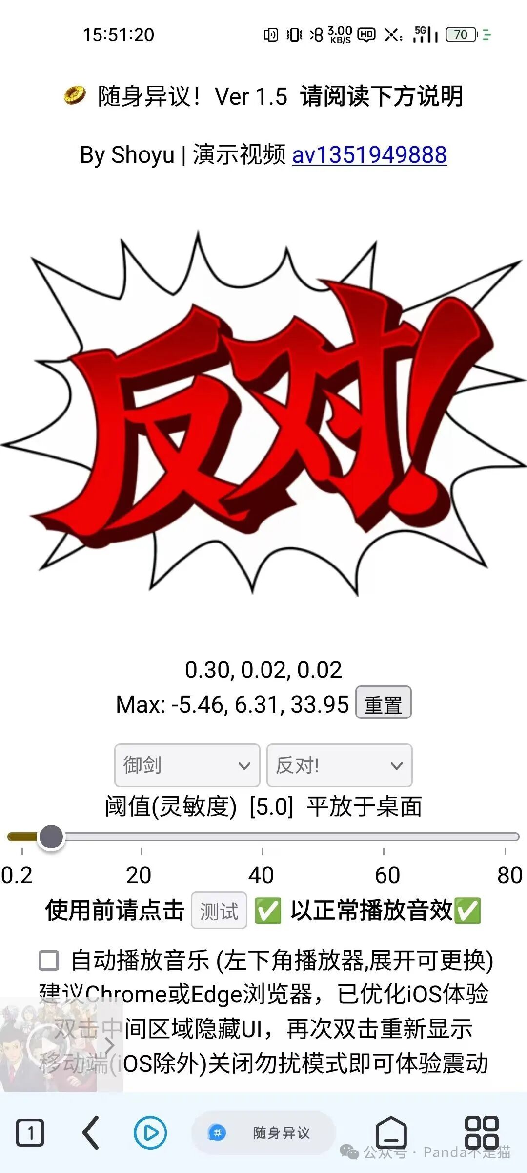 通过拾取声音,可以触发逆转裁判中的各种否决异议的音效以及动画。虽说没什么用的项目,但他有趣啊。项目中也有很多其他动画以及音效,想一想和别人正在争论,这时候你打开网页,起身直接一个拍桌,配合上这个项目以及音效,随便占领道德制高点!