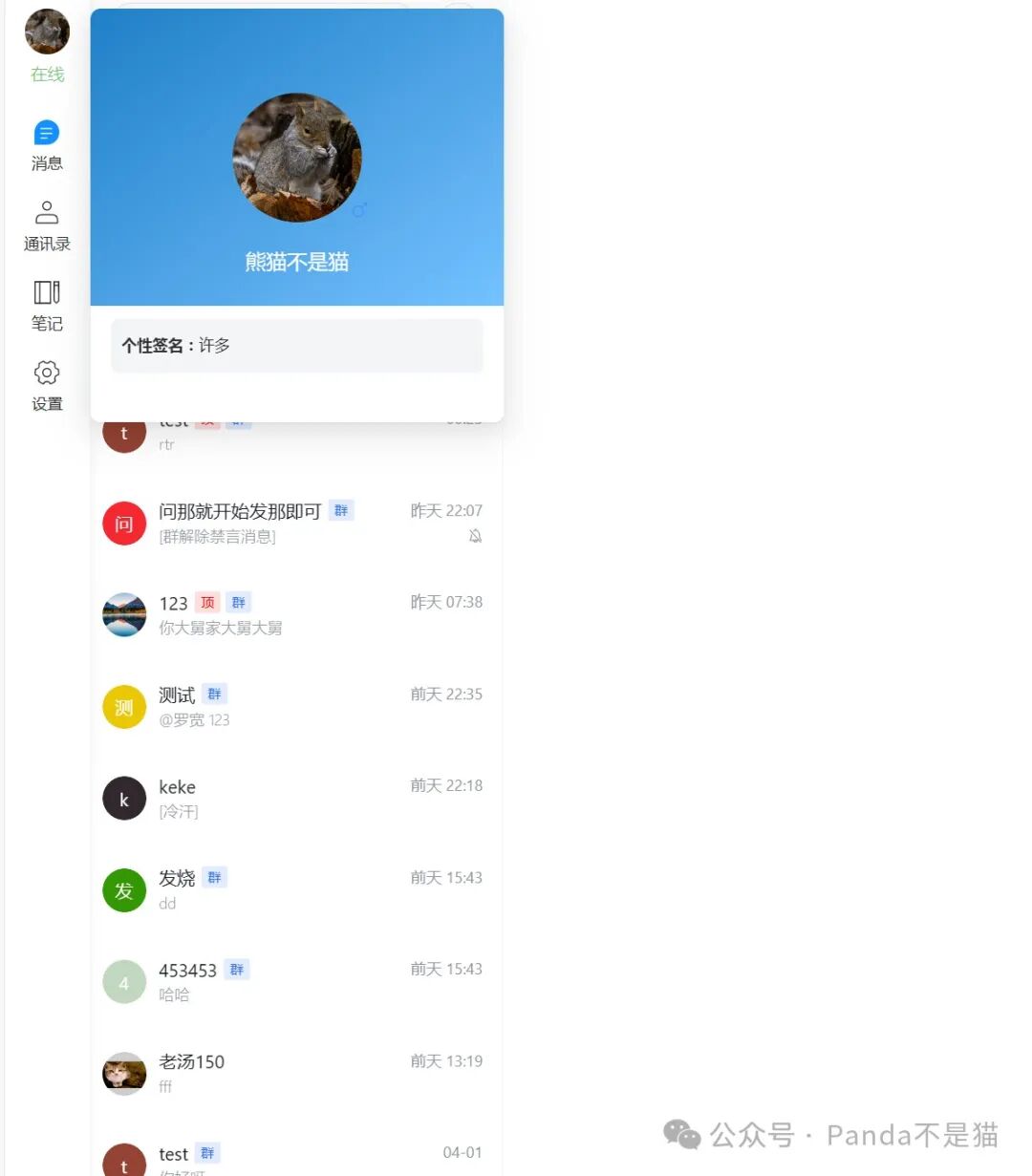 对比上一个,功能更为强大。支持私聊及群聊,支持多种聊天消息类型 例如:文本消息、代码块、群投票、图片及其它类型文件,并支持文件下载,支持聊天消息撤回、删除(批量删除)、转发消息(逐条转发、合并转发),支持编写笔记。前端使用 Naive UI + Vue3,后端采用 GO 开发。