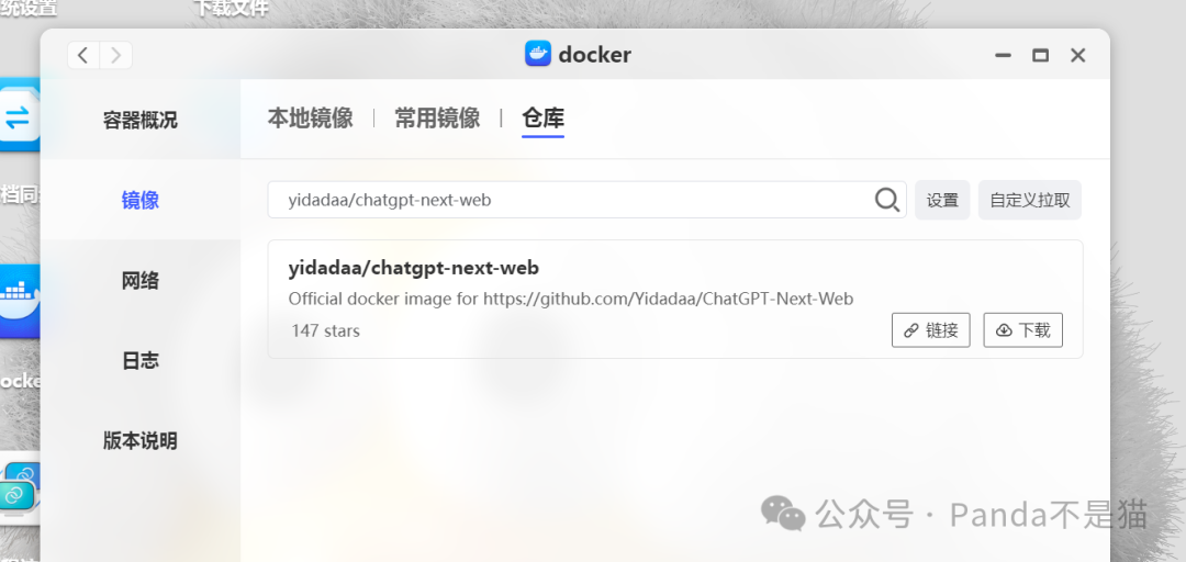 NextChat的部署并不难,首先我们访问极空间的Docker界面,在仓库中直接搜索yidadaa/chatgpt-next-web,如果下载超时,可以通过自定义拉取加代理的方式。