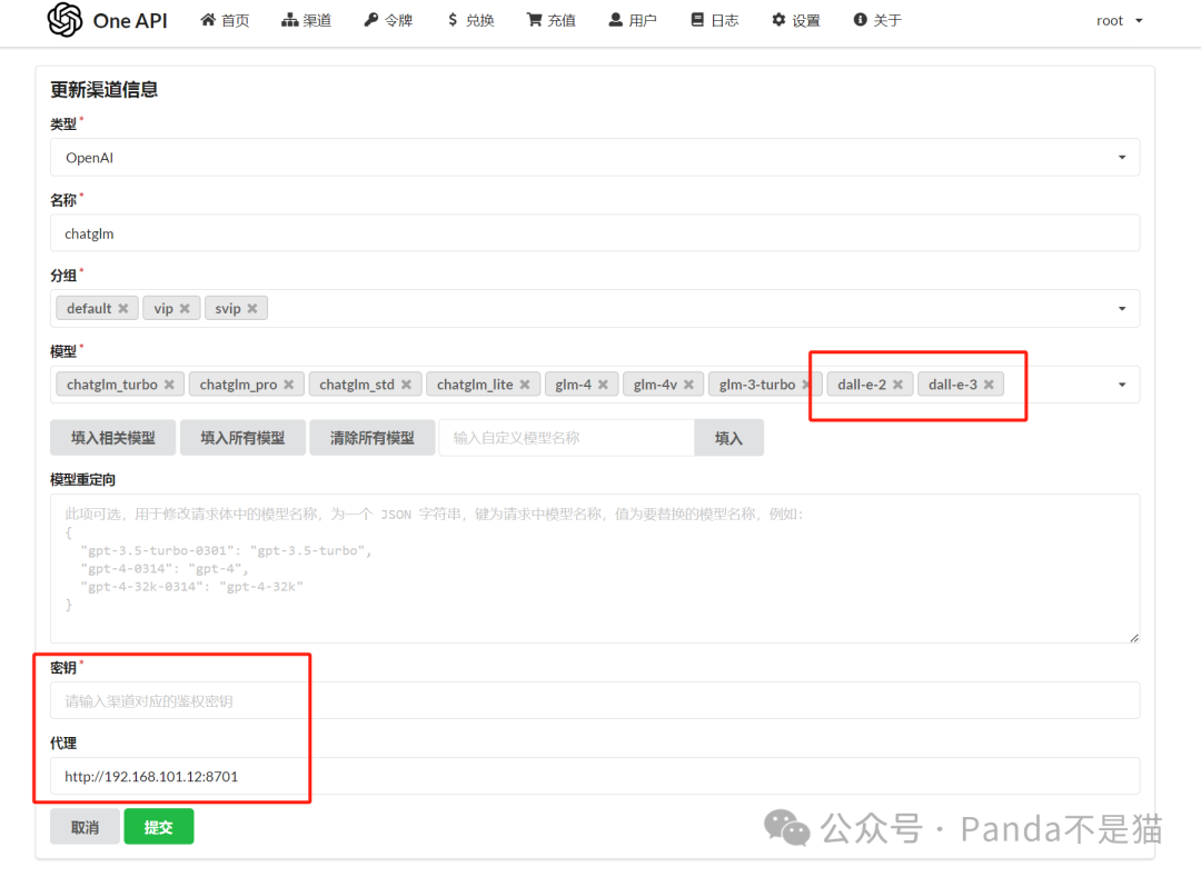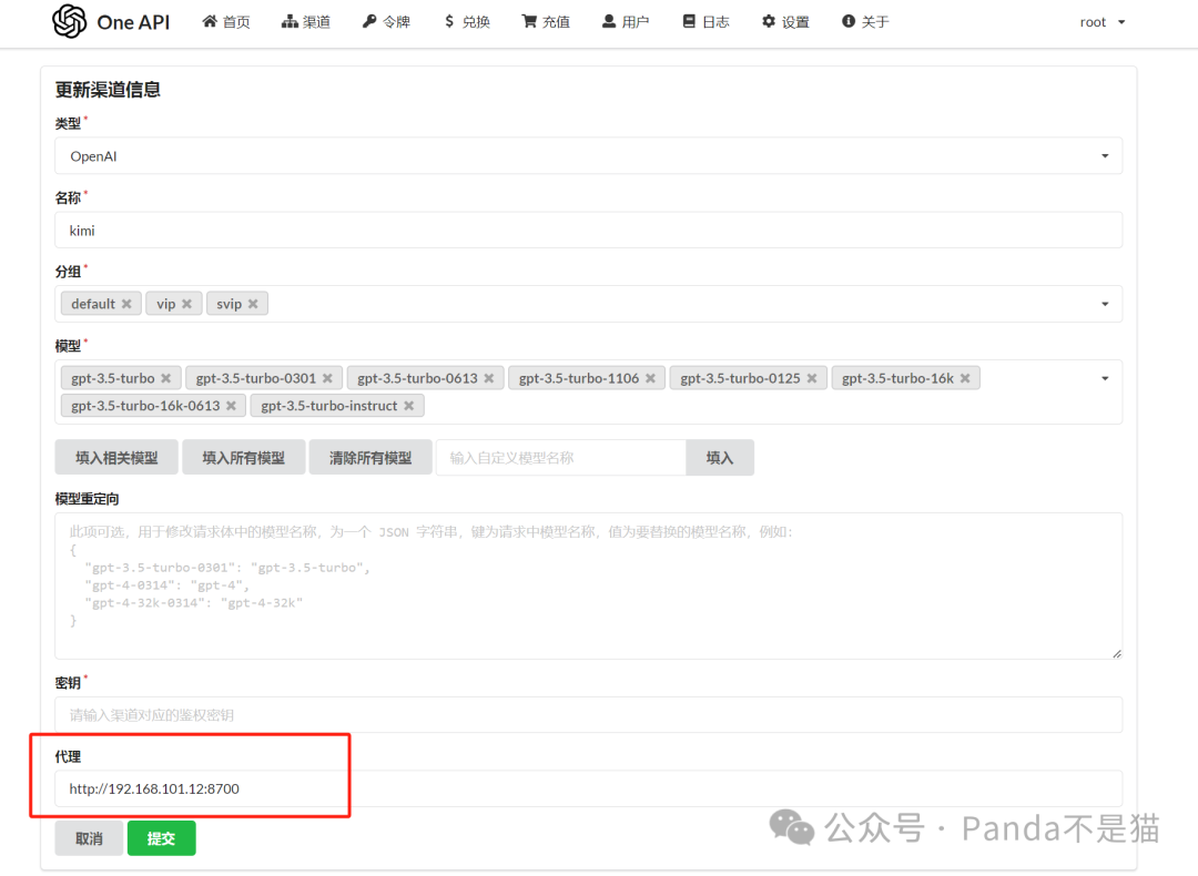 最后我们打开刚刚部署的one api项目界面,在渠道中添加kimi以及智谱清言,这里需要注意模型的选择,kimi由于不支持ai绘画,所以只需要选择对话模型即可,可以参考我这里的设置,代理地址便是我们刚刚搭建的kimi接口地址,密钥则是我们刚刚通过F12获取的值。