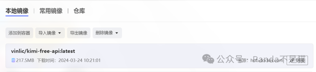这里我们已经为api的接入做好了所有准备工作了,接下来便是大模型的api搭建。首先是kimi模型。直接打开Docker仓库界面搜索:kimi-free-api下载镜像,镜像并不大,部署好也就200多M。(需要注意的事,该项目目前仅用于自用,再次感谢LLM Red Team大模型红队组织的开源项目。)