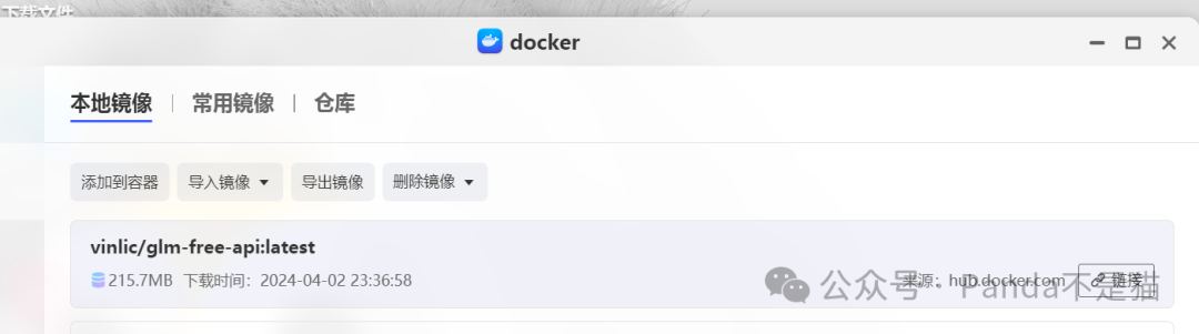 这时候我们便得到了kimi的api接口以及key。由于kimi目前不支持ai绘图,所以我们还需要其他模型,所以这里我们再采取LLM Red Team大模型红队的开源项目glm-free-api来获取智谱清言的api接口以及key。Docker中搜索vinlic/glm-free-api下载镜像。