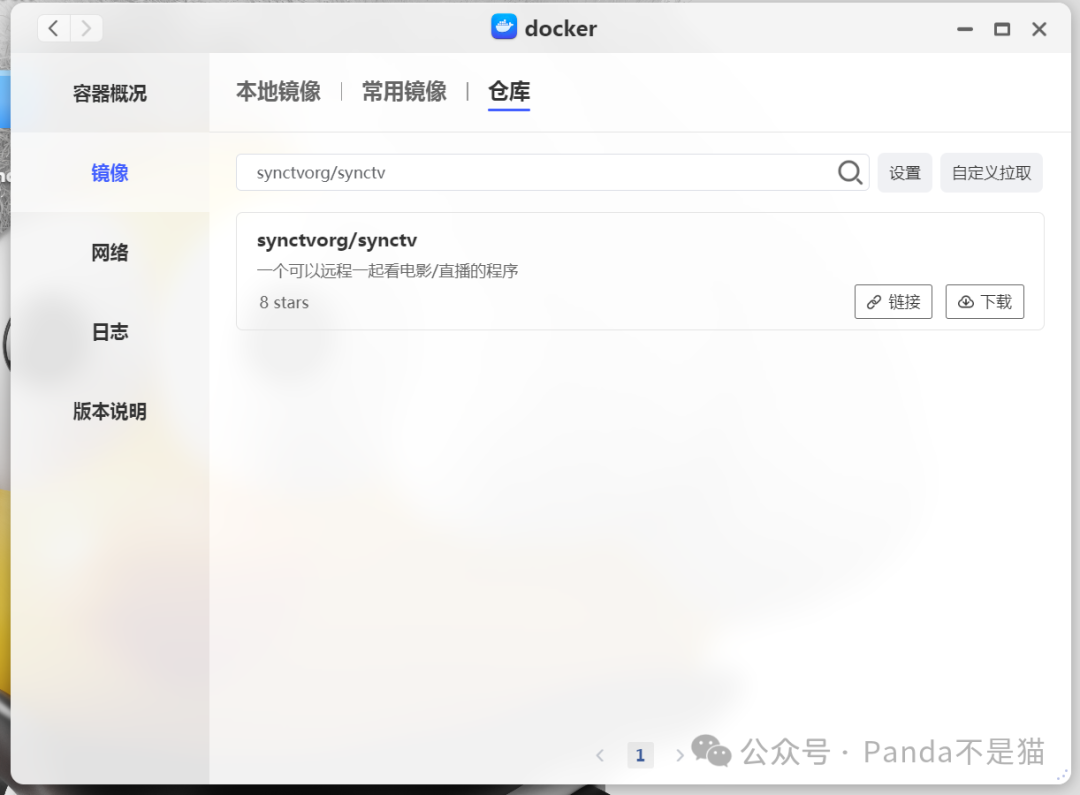 该项目的部署很简单,直接在Docker仓库中搜索synctvorg/synctv镜像,下载即可。如果下载过慢,那么可以考虑加个代理提提速。