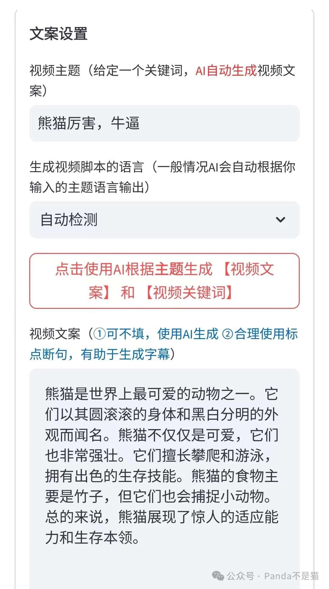 底部的文案设置你可以直接给到视频主题,随后选择自动生成,AI会根据你给的主题来生成视频的文案以及视频关键词。关键词目前不支持中文,且如果需要使用中文文案,那么你的网络需要特殊处理一下才行。