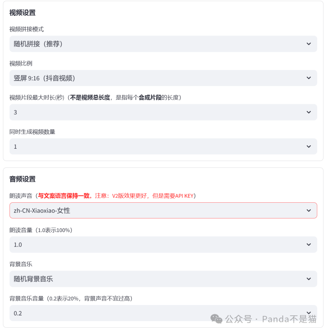 项目拥有webui,方便你根据自己需求调整参数或者模型生成视频,在这里可以设置你需要使用的模型,同时也可以调整文案、背景音乐、配音以及视频比例等等内容。
