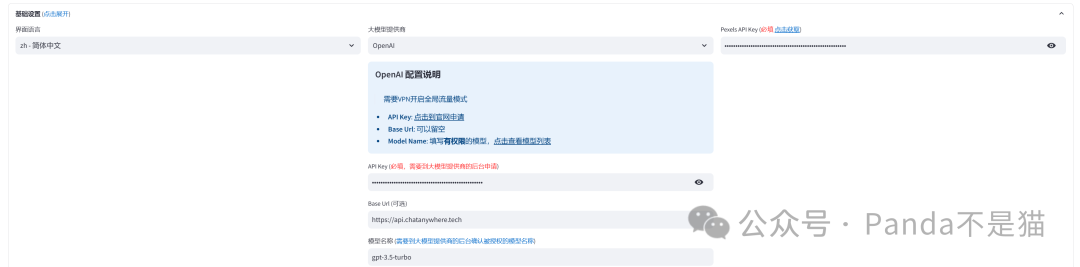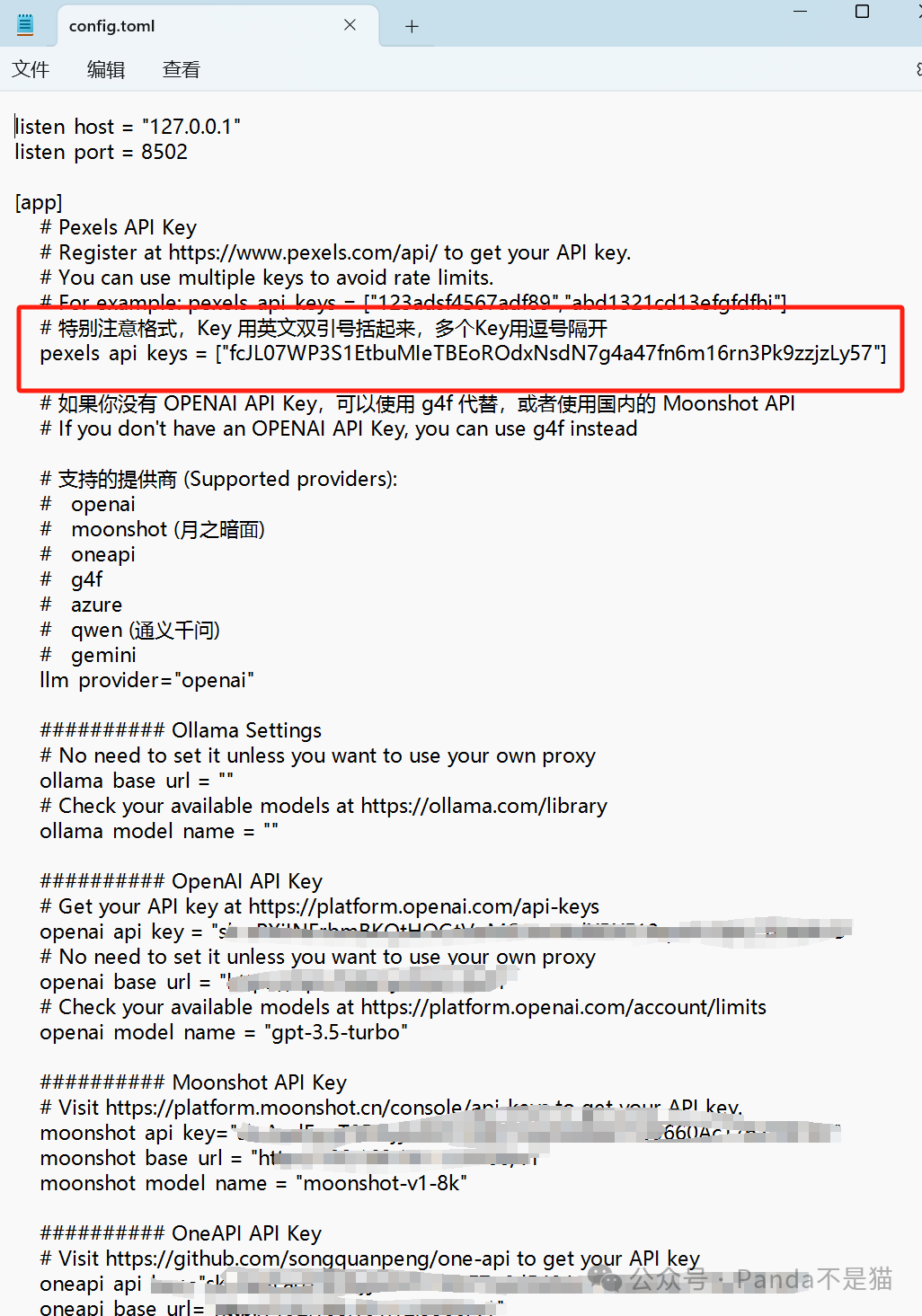 随后将项目根目录中的config.example.toml文件打开,将你要用的模型填进去,同时填上Pexels的API Key,这样方便固化。当然了也可以不用管,后期项目部署好之后直接去webui填写。