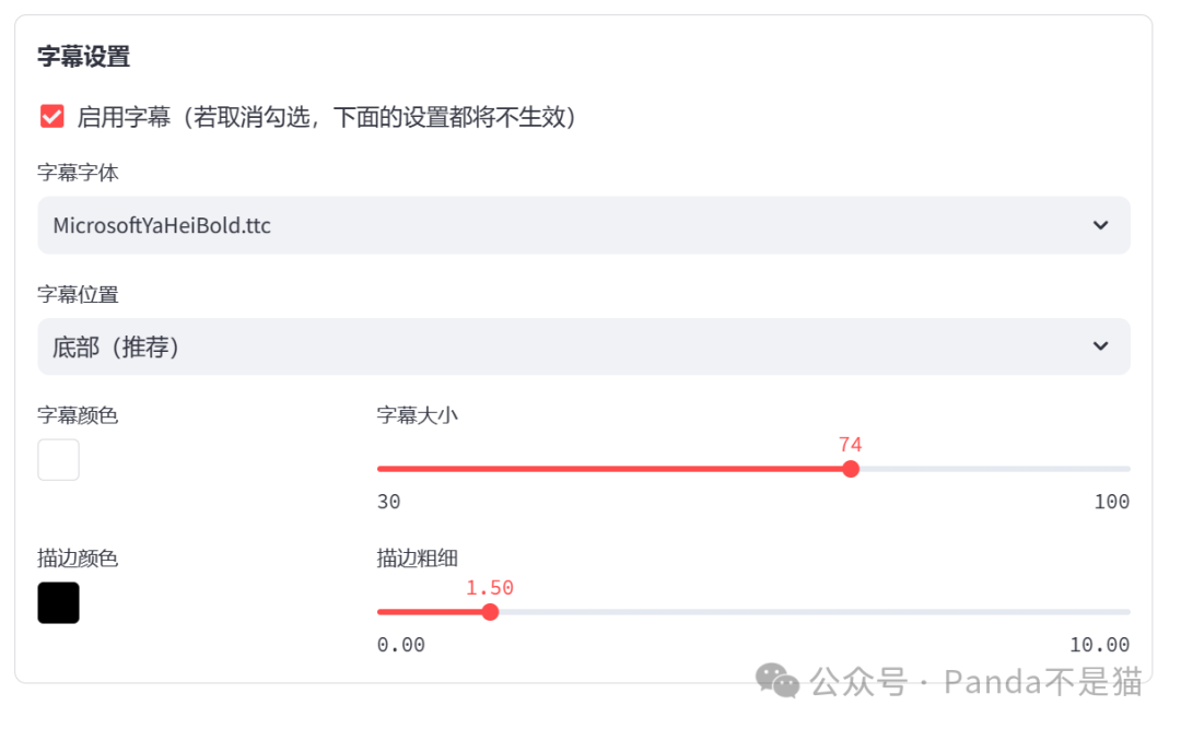 最后则是字幕了,可选择是否启用字幕,同时字幕的位置、字体以及颜色和描边都是可以调整的。
