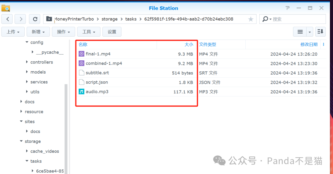 最后生成的视频会保存在项目文件夹的storage/tasks文件夹中,每段视频都会有一个单独的文件夹,点进去就能看到字幕文件、音频文件以及视频。