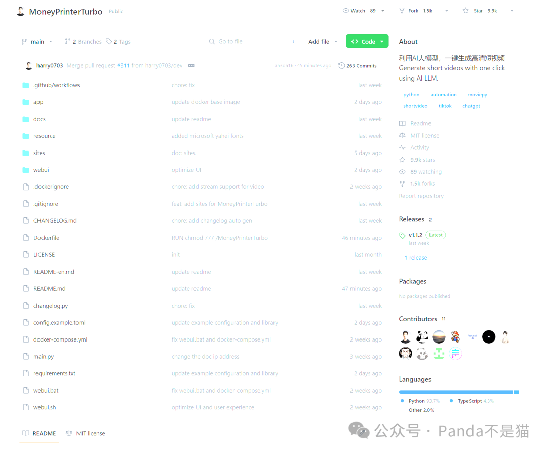 今天这个项目有意思,也是很早之前就发现了,但当时忘记了写。最近没事干又翻出来玩玩,同时发现项目更新了很多东西了,于是翻出来写写。MoneyPrinterTurbo—一个可以一键生成高清短视频的项目,只需提供一个视频 主题 或 关键词 ,就可以全自动生成视频文案、视频素材、视频字幕、视频背景音乐,然后合成一个高清的短视频。