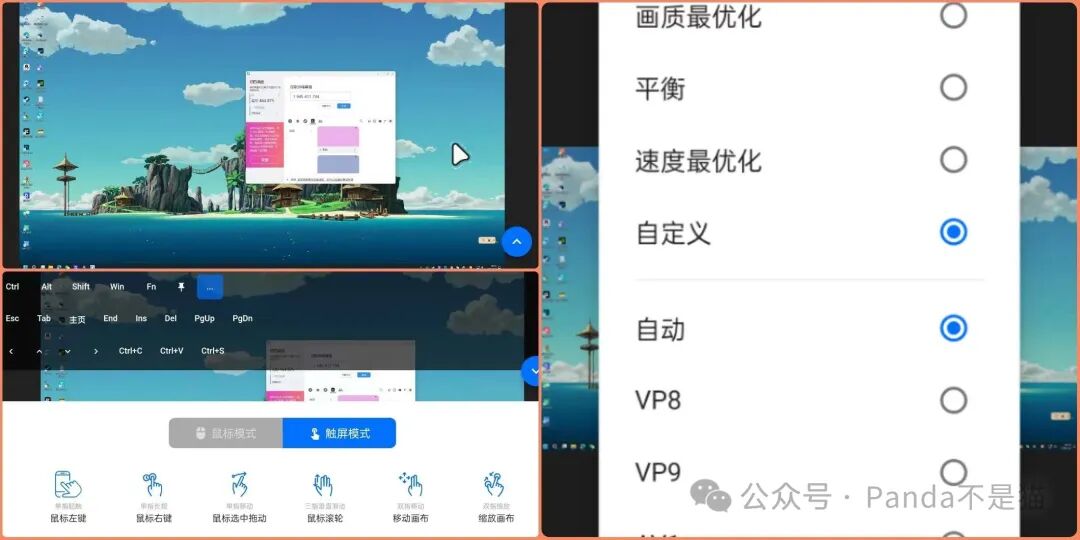 而在手机远控上,你可以选择传统的鼠标操作方式,也可以选择适配手机的触控操作方式。同时你也能进行画面质量的选择以及编码形式选择。Rustdesk的清晰度以及连接的稳定性上没得说,毕竟是老牌开源项目了。