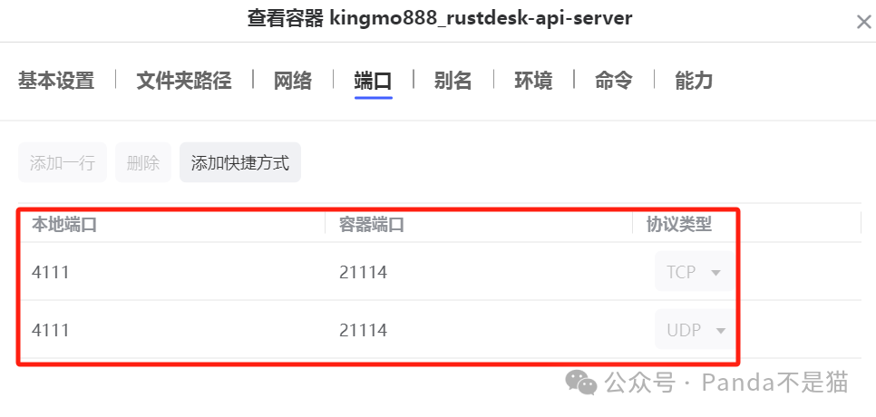 端口方面因为是远控软件,所以这里需要将21114的tcp协议以及udp协议都映射出去,不然会出现远控无法连接的情况。