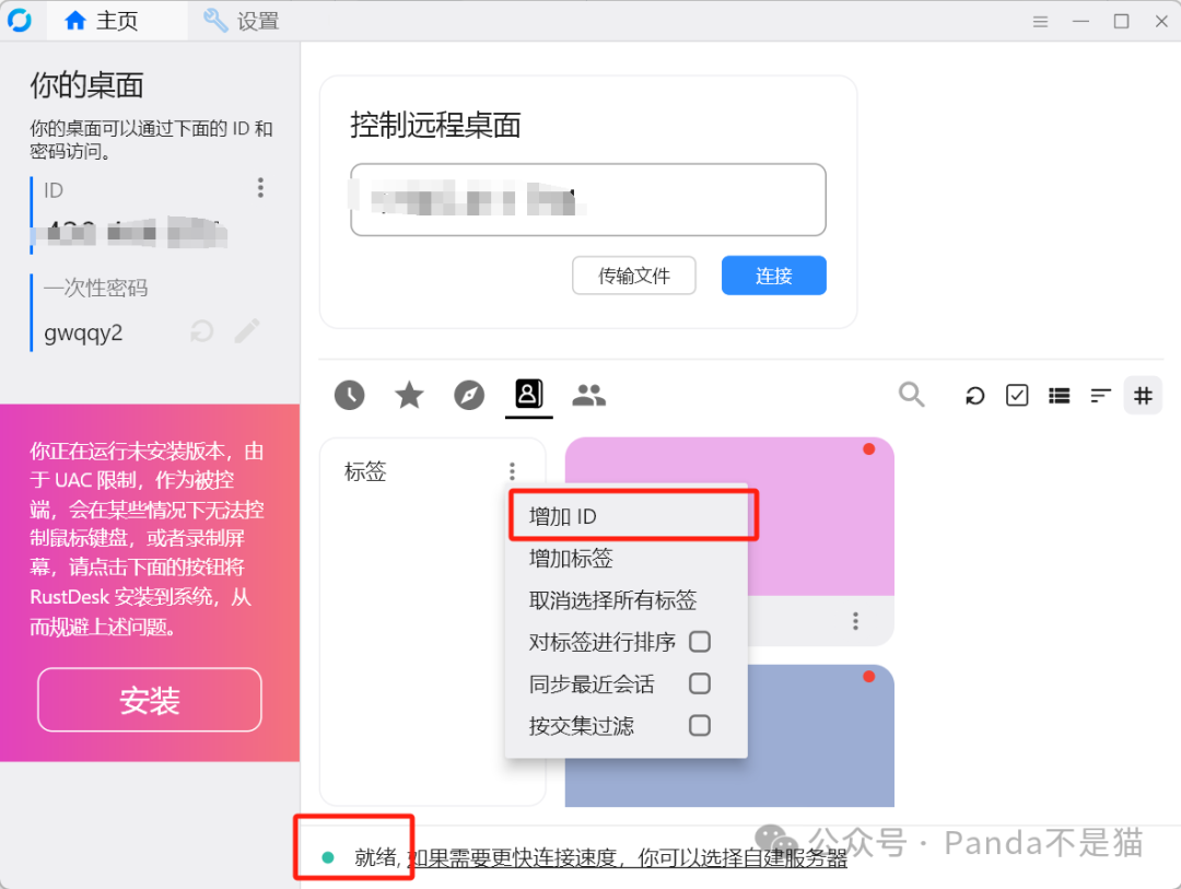 怎么连接设备呢?去rustdesk官网下载对应的系统客户端,将其中的api服务器地址填写为你的项目地址,填写完毕之后能看到客户端下方显示的就绪,这时候就可以通过ID进行远控操作了,也可以直接将ID添加到设备中去。