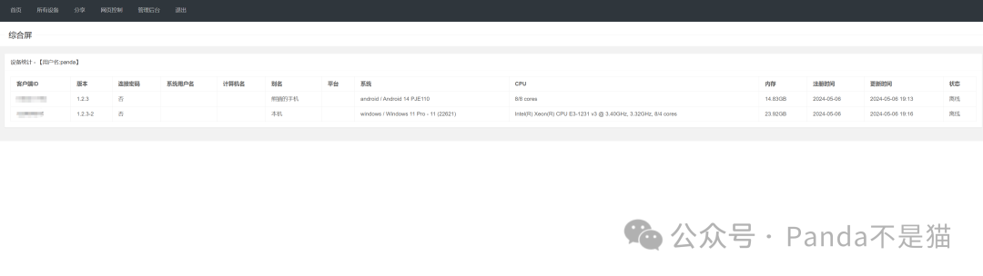 在项目的首页你能看到一个综合屏,这里会展示你的所有设备,例如我这里添加了我的电脑以及我的手机。同时每个设备也能看到相应的信息,例如客户端的ID、版本、是否需要密码连接以及系统和CPU等等信息。