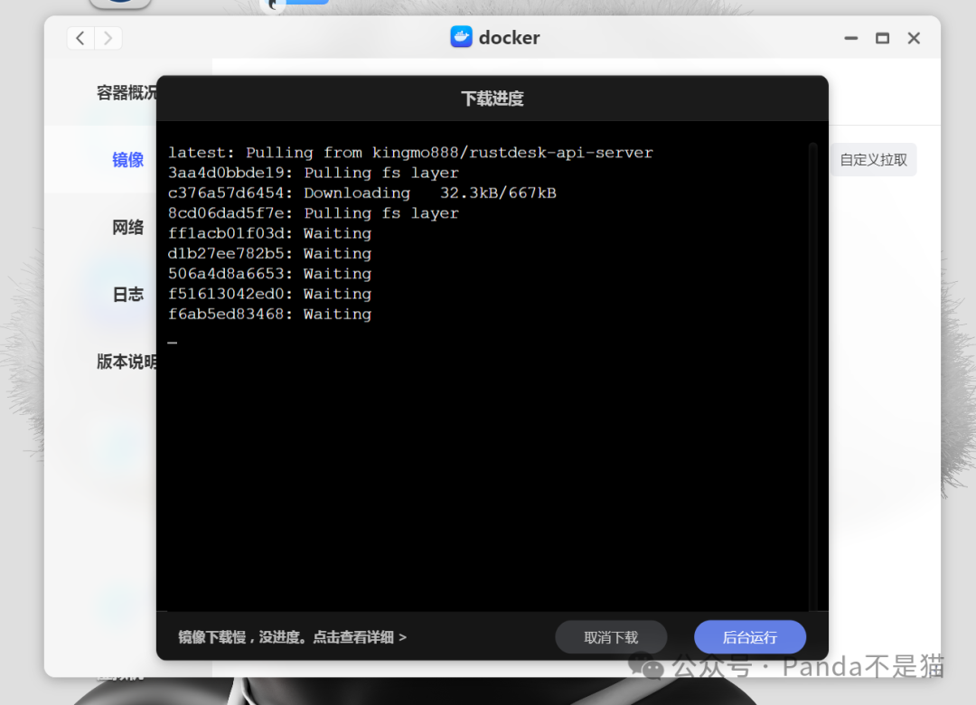该项目存在ghcr.io库中,所以我们要使用到自定义拉取的功能。打开docker界面,在仓库中选择自定义拉取,前缀的docker pull不用输入了,后面填入ghcr.io/kingmo888/rustdesk-api-server:latest,随后直接下载镜像。