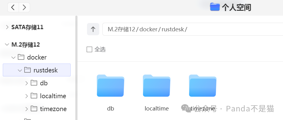 首先我们需要创建好需要的文件夹,用于数据的持久化。这里在docker文件夹下新建rustdesk文件夹,并在其中新建子文件夹db、locatime以及timezone三个文件夹。