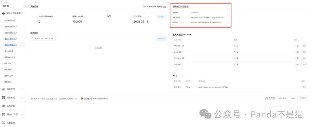 至于配置参数,可以到讯飞开放平台免费领取,免费的额度有十万的TOKEN完全够用了。