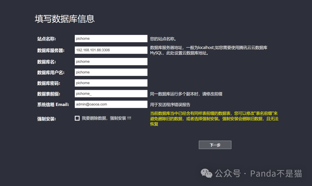 数据库填写这里,地址记得填写本地IP。随后再直接安装,这里需要稍微等待一下,安装完成会弹出管理员注册的界面。