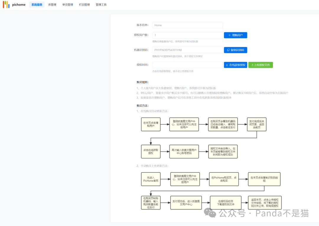 系统管理中可以看到系统信息、库管理、单页管理、栏目管理以及管理工具。系统信息中会显示你的版本,用户数以及机器码。该项目如果是个人一个用户使用,那么永久免费,多用户使用则需要付费团队版了,99元以用户的售价你们觉得合适吗?