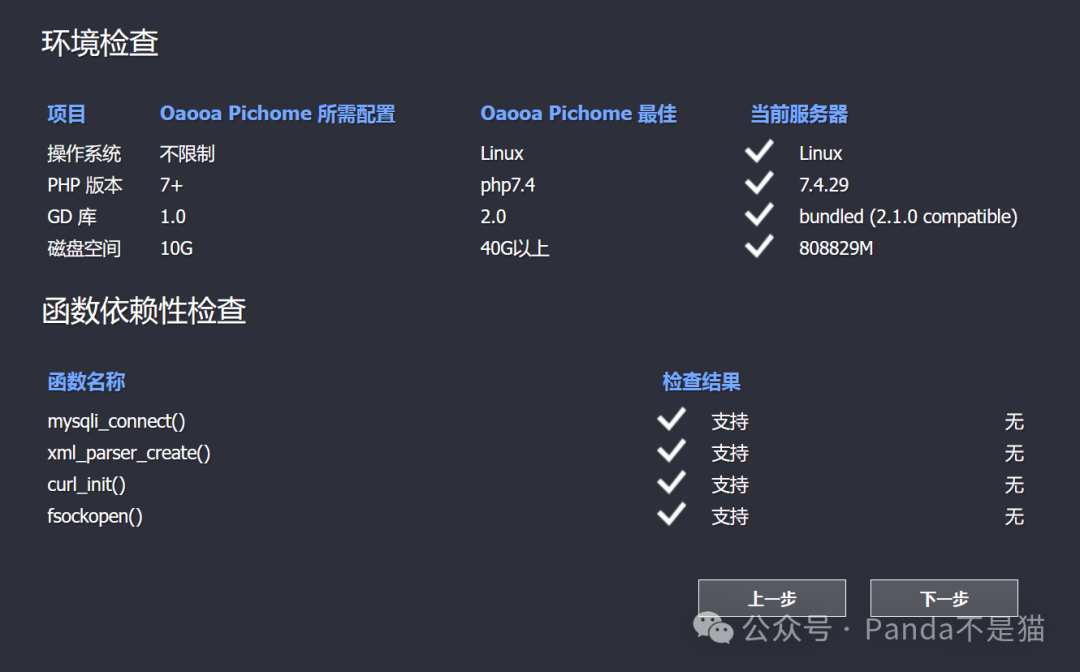这时候我们浏览器访问http://nasip+端口号就可以看到安装程序了。根据提示选择下一步,能看到各项检测,一直下一步便会看到数据库配置。