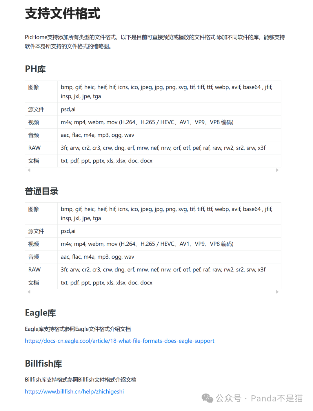 库管理中项目又分为了四项,分别是PicHome库、普通目录、eagle库以及billfish库。根据库的不同,支持的文件格式也不同,看项目介绍理论上支持所有文件格式,比如果子的3D照片、以及一些贴图和源文件都支持。详细文件格式可以去项目手册查看PicHome手册 (yuque.com)