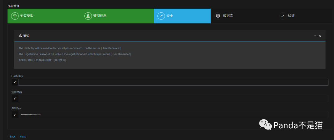 安全部分输入Hash密码和注册密码,API密码是自动生成的,不需要管它,然后Next即可。