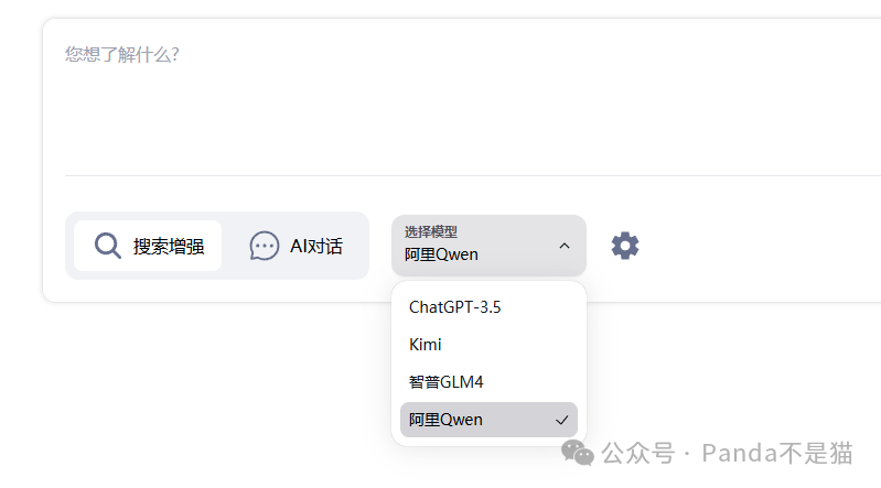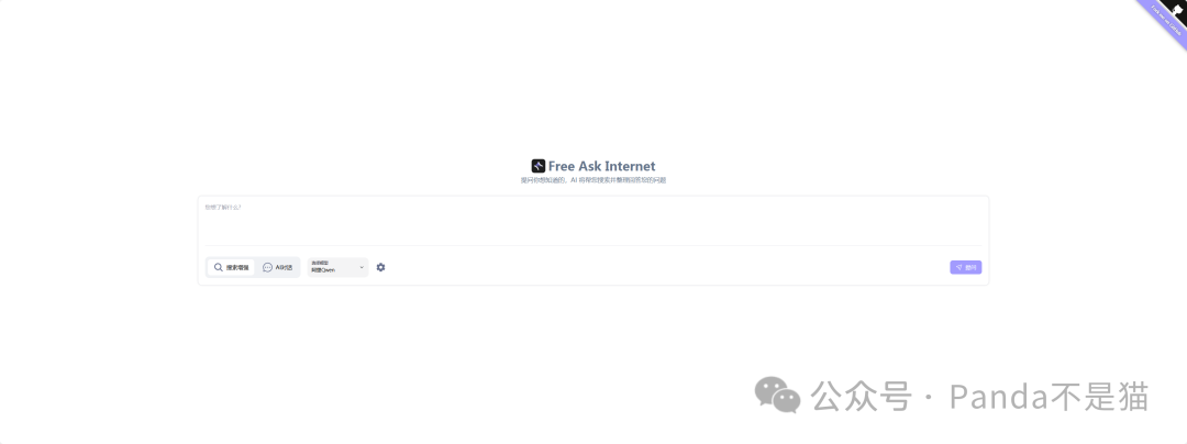 FreeAskInternet的首页很简洁,中间是搜索输入栏,在输入栏的下面有搜索增强与AI对话两种功能选择,同时也支持模型的切换。