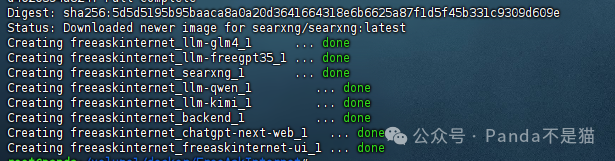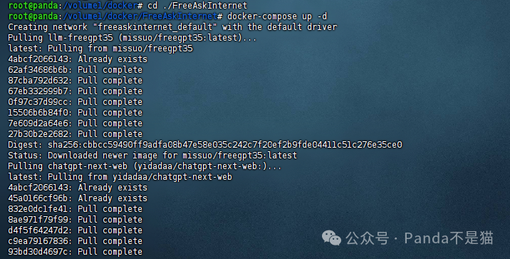 最后cd ./FreeAskInternet到项目根目录,输入docker-compose up -d启动容器,这里需要注意的是,该项目的本地端口默认为3000,如果有冲突,记得更改一下docker-compose.yml文件中的端口。