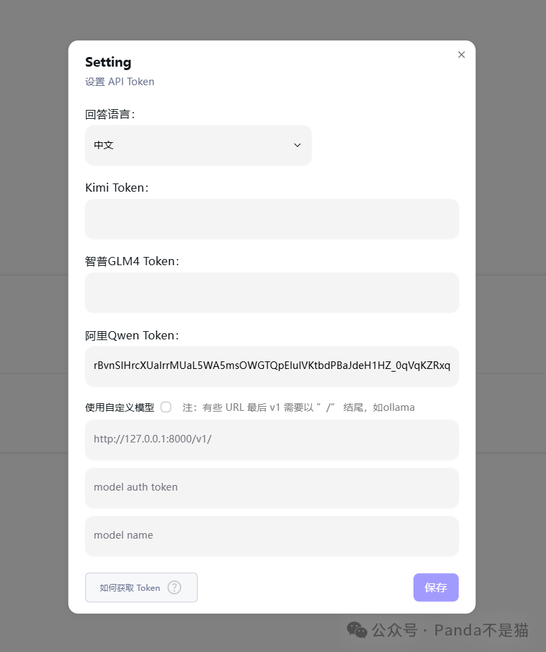 项目设置界面支持回答语言的切换,目前支持中繁英三种。模型上,支持ChatGPT3.5 / Qwen / Kimi / ZhipuAI(GLM)api,同时也支持自定义LLM,本地 ollama等模型。