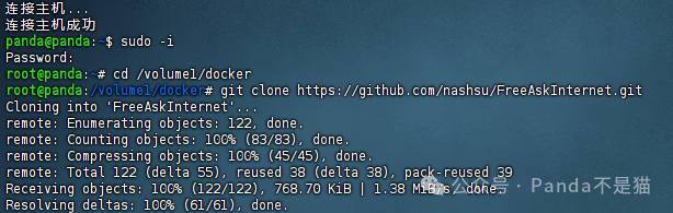 这里我SSH连接群晖之后通过cd /volume1/docker移动到我docker的根目录文件夹下,随后再输入git clone https://github.com/nashsu/FreeAskInternet.git直接拉取项目文件。