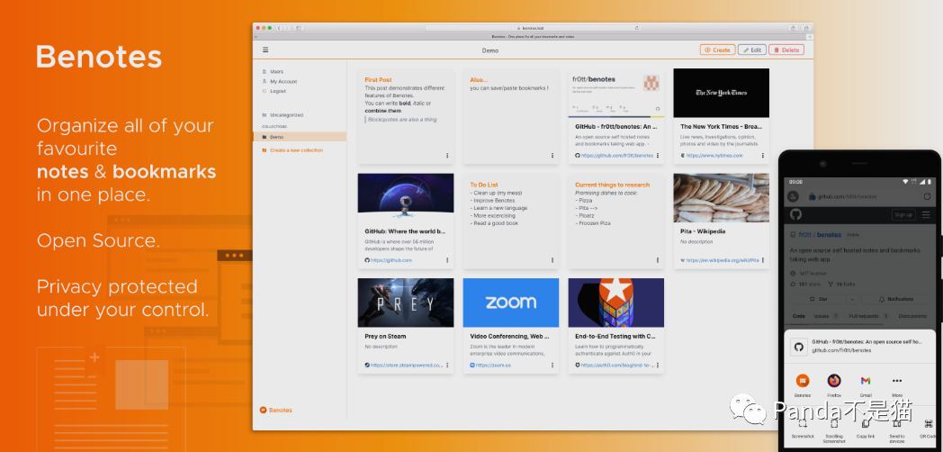 Benotes 一个开源的自托管笔记和书签网络应用程序。使用 Laravel 和轻量级 Lumen 框架构建,可以作为 PWA 安装并托管在几乎任何地方。同时支持 Markdown 和富文本编辑器。(因为写东西的原因,我也算是用过很多笔记软件以及web端的markdown编辑器了,最后我还是无脑推荐obsidian)