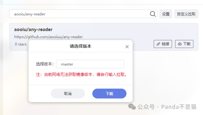 项目的部署并不难,在Docker仓库界面搜索「aooiu/any-reader」,标签记得选择「master」,直接下载镜像。