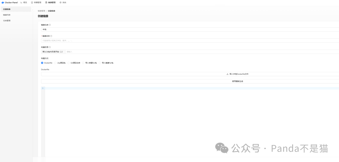 镜像管理中可以选择镜像仓库,镜像仓库在仓库管理中可以新建,例如最近Docker不好访问,我们就可以添加可访问的镜像站进去。同时构建方式支持Dockerfile、zip源码、git仓库、容器的tar与镜像的tar包。
