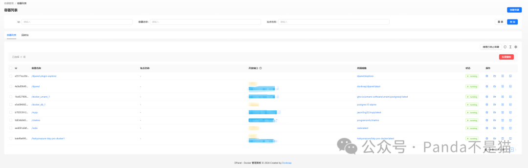 在容器管理面板能看到容器的ID、容器名、暴露端口以及镜像名和运行状态。