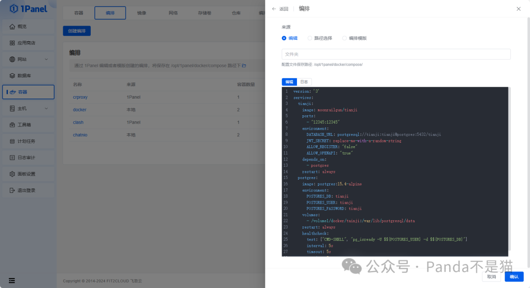 将文件夹保存到nas中,或者使用第三方的docker工具运行docker-compose up -d。这里推荐熊猫使用的1Panel,容器管理功能很强大,至于怎么在nas上搭建1Panel,可以详细看之前的文章。
